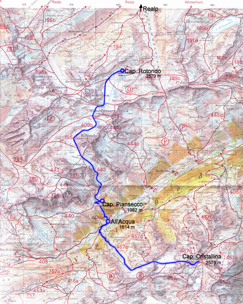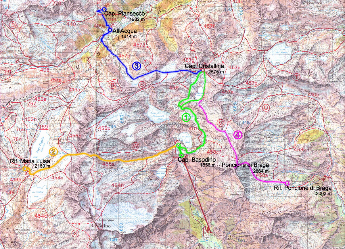 Karte cpna. Basòdino - via lago Sfundau – lago Bianco (1) rif. Maria Luisa (I) – via Btta. di V. Maggia o Kastellücke (2) cpna. Piansecco – via discesa su All’Acqua (3) rif. poncione di Braga - Via Poncione di Braga (4) Capanna Rotondo - vai passo di rotondo -> Karte Die vorgeschlagenen Touren sind rein indikativ. Jeder ist für die Wahl der Route selber verantwortlich
